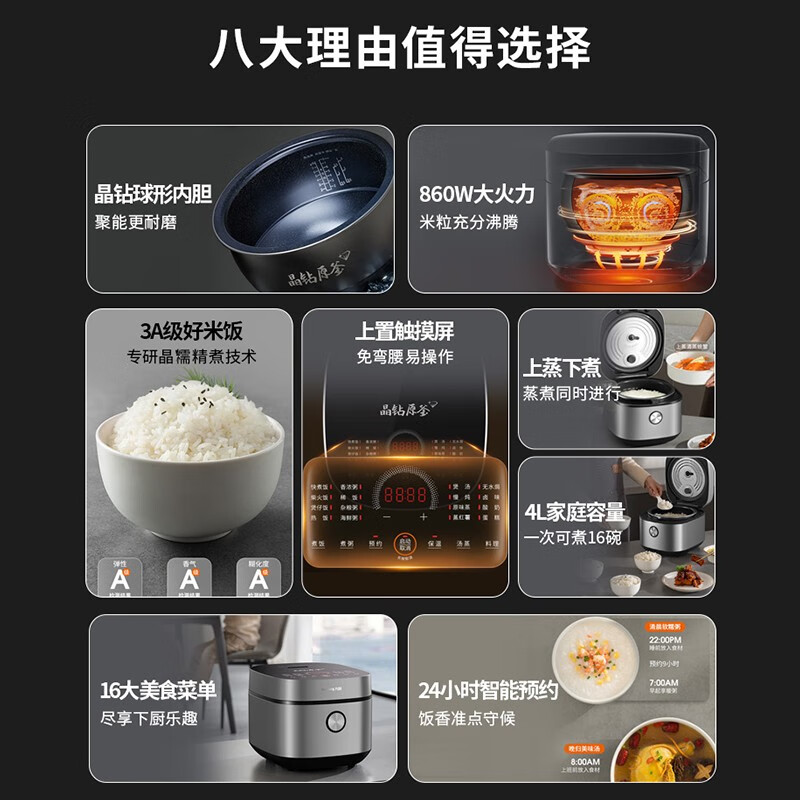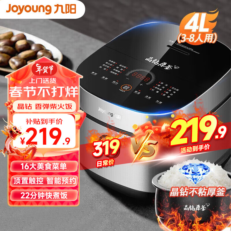 九阳(Joyoung)电饭煲电饭锅家用4升蓝钻厚釜球胆智能保温5-8人使用16大菜单可预约酸奶蛋糕柴火饭不粘锅触控面板 收藏加购当天发价格:339.90元!