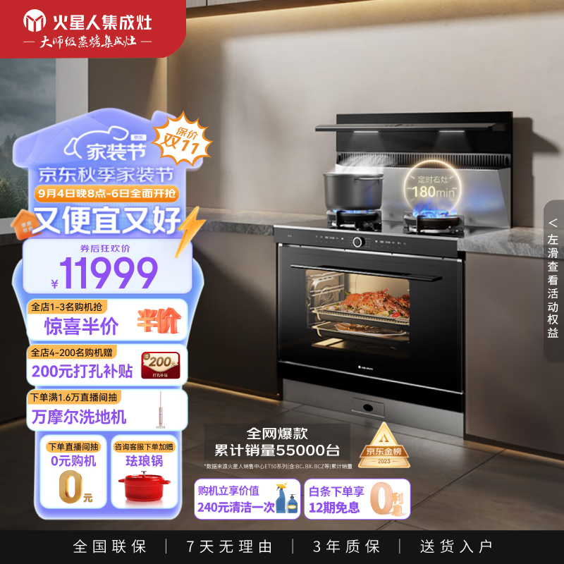 火星人集成灶 ET50BC Pro【门店同款】集成灶一体式 变频22风量大吸力抽油烟机 5.0kW燃气灶天然气价格:12549.00元!