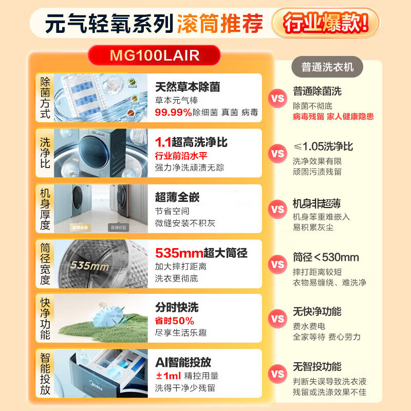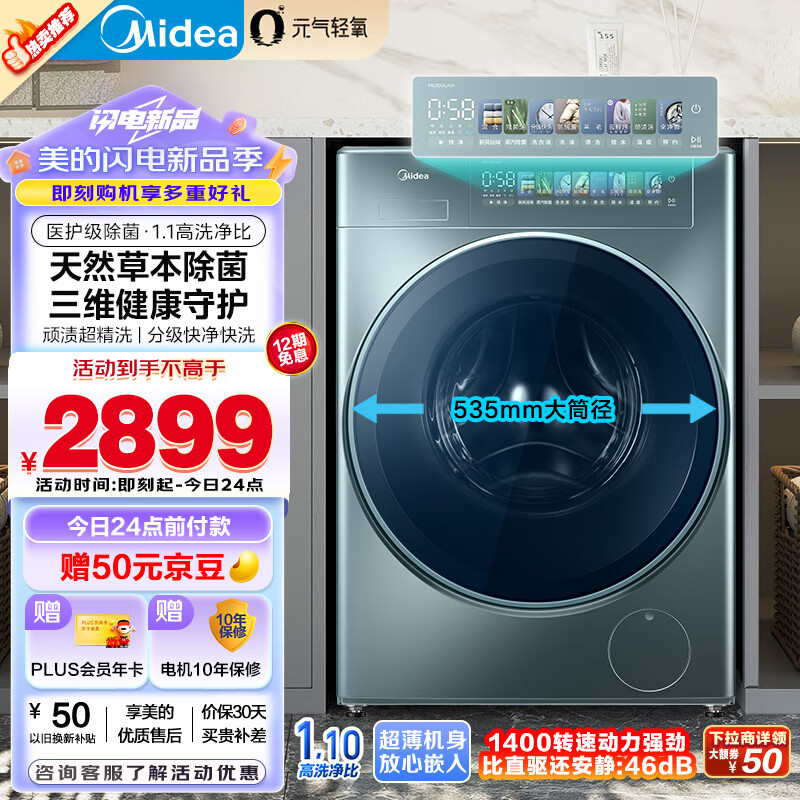 美的(Midea)滚筒洗衣机全自动家用 MG100LAIR 10公斤 元气轻氧 天然草本除菌 超薄全嵌 1.1洗净比 智能投放价格:2899.00元!