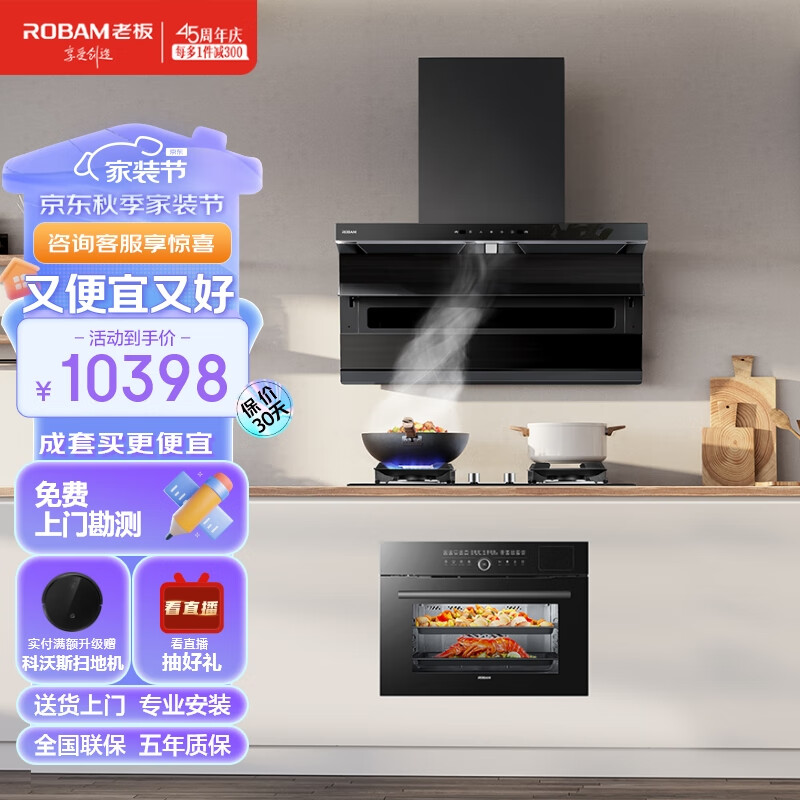 老板(Robam)小黑翼家用顶侧双吸抽油烟机大吸力25风量顶侧油烟机蒸烤一体机厨房多件套D1+57B2DT+CQ9062D价格:9288.00元!