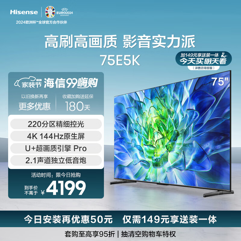 海信电视75E5K 75英寸 220分区 4+64GB 4K 144Hz超高清高刷高画质 液晶智慧屏 大屏巨幕平板 以旧换新价格:3999.00元!