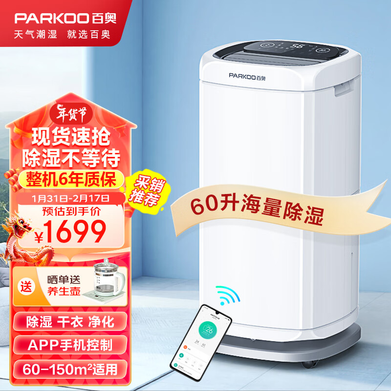 百奥(PARKOO)除湿机/抽湿机 除湿量60升/天 App控制 空气净化 家用地下室复式别墅商用工业吸湿器 PD602AR价格:1887.00元!