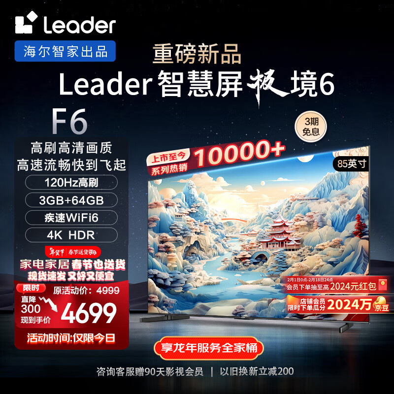 Leader海尔智家出品L85F6 85英寸小超跑智慧屏120Hz高刷游戏电视双频WiFi6护眼防蓝光3GB+64GB一触投屏价格:4699.00元!