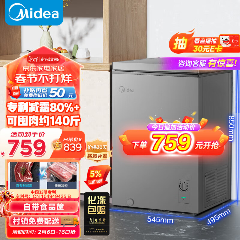 美的(Midea)100升 减霜家用囤货小冷柜 冷藏冷冻转换冰柜 一级能效母婴母乳小冰箱 BD/BC-100KMF(E) 以旧换新价格:782.40元!
