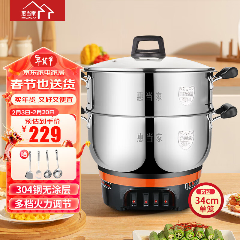 惠当家(Hui Dang Jia)电锅多功能电热锅电炒锅家用电蒸锅一体电煮锅加厚304不锈钢电火锅 34CM一蒸格【全304钢5-8人】价格:229.00元!