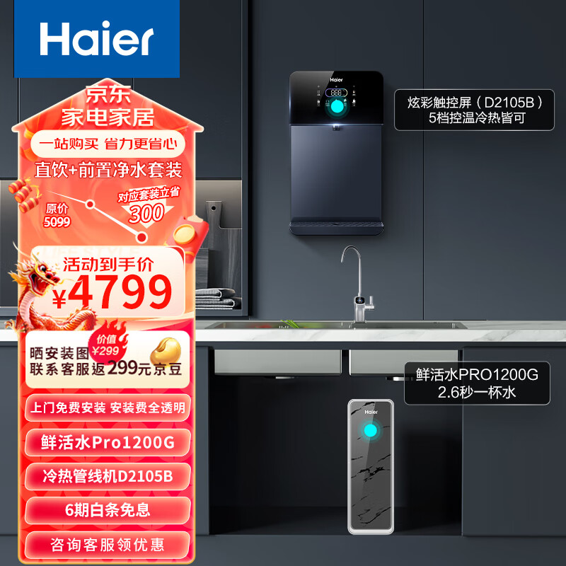 海尔(Haier)净水器1200G鲜活水 pro家用净水机6年RO反渗透过滤器净水器+管线机套装HKC3000-R793D2U1+D2105B价格:4799.00元!