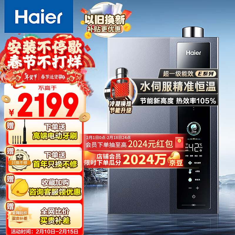 海尔16升燃气热水器天然气家用超一级能效节能升级款水伺服恒温多重净化智慧E感温 JSLQ27-16E5DLPCU1价格:2199.00元!