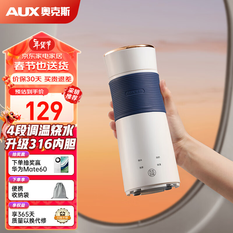 奥克斯(AUX)电水壶 电热水壶 旅行便携式烧水壶 316不锈钢插电保温 电热水杯加热HX-DR20蓝色价格:129.00元!