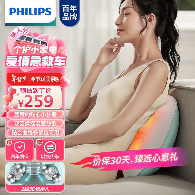 飞利浦(PHILIPS)腰部按摩器按摩抱枕靠枕办公室靠垫无线热敷腰背按摩靠垫 全身肩颈椎腰背部按摩器心形抱枕3112B绿价格:289.00元!