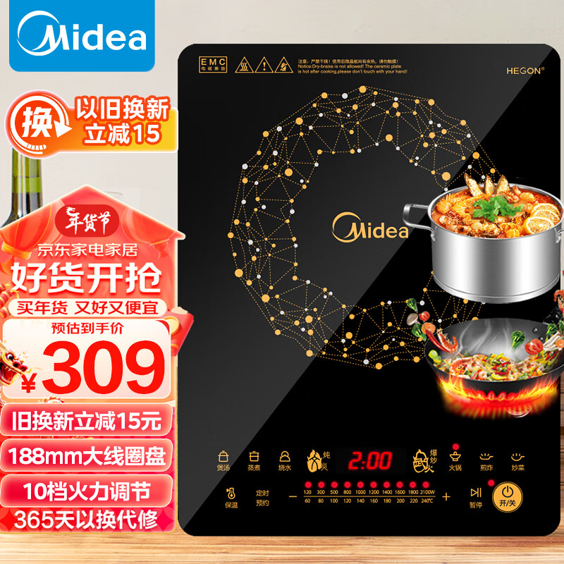 美的(Midea)电磁炉 火锅炉匀火 智能定时 十档火力 C21-WT2118(标配欧式汤锅+炒锅)价格:339.00元!