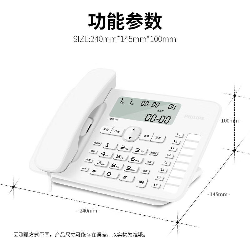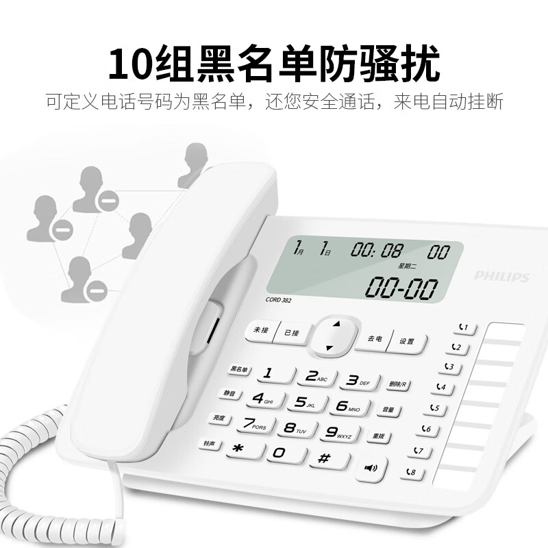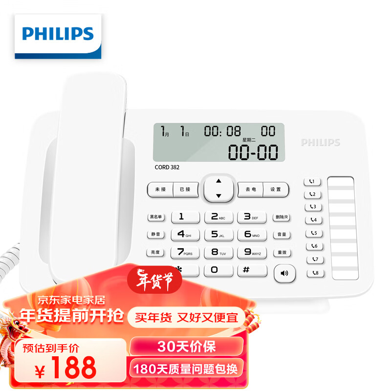飞利浦(PHILIPS)电话机座机 固定电话 办公家用 免提通话 免电池 来电显示 8组一键拨号 黑名单 CORD382 白色价格:188.00元!