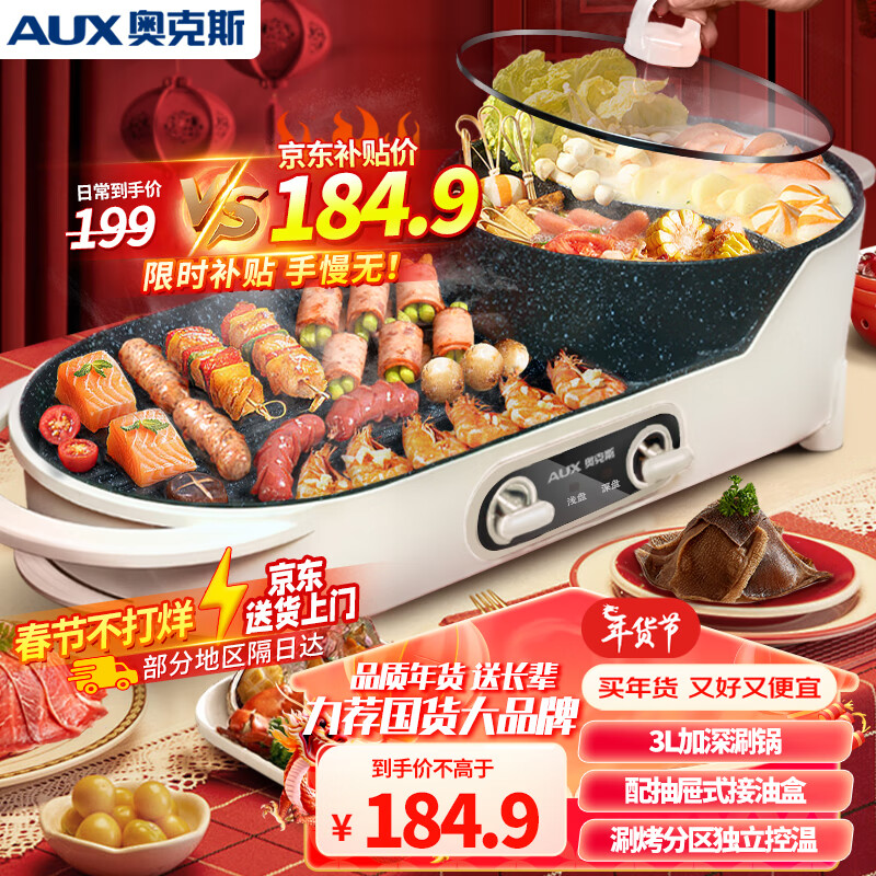 奥克斯(AUX)电烤炉 电烧烤炉 多功能锅鸳鸯电火锅 家用无烟电烤炉 电烤盘 烤涮一体两用锅LA-JDY01B价格:184.90元!