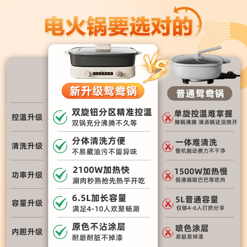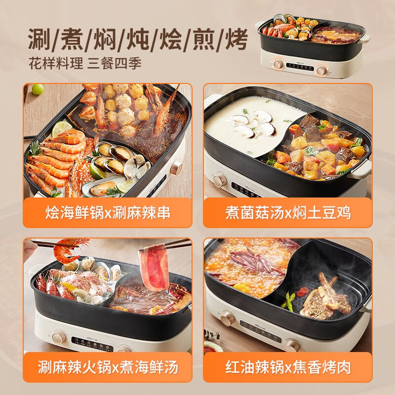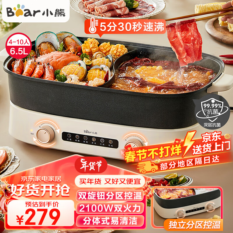 小熊(Bear)火锅专用锅 鸳鸯锅 电火锅 多功能锅 6.5L大容量 双旋钮独立控温 分体式家用电煮锅电热锅多用途锅 【2100W大火力|6分钟速沸】 6.5L价格:279.00元!