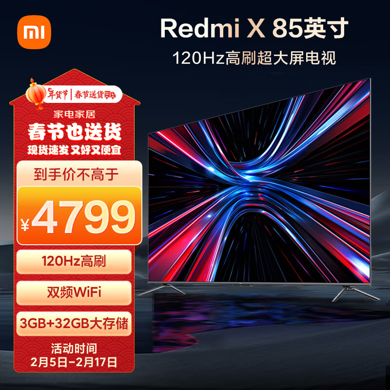 小米电视 Redmi X 85英寸 3+32GB大存储 120Hz高刷 4K屏 液晶智能平板75英寸+电视机L85RA-RX价格:4799.00元!