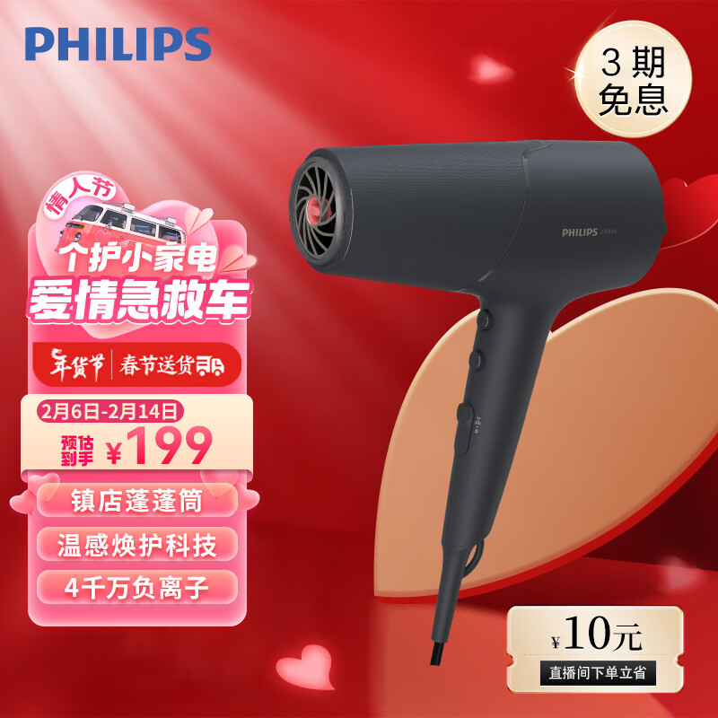 飞利浦(PHILIPS)电吹风机 5系蓬蓬筒 温感焕护4000万负离子 大功率速干 蓬松高颅顶 扁塌克星价格:199.00元!