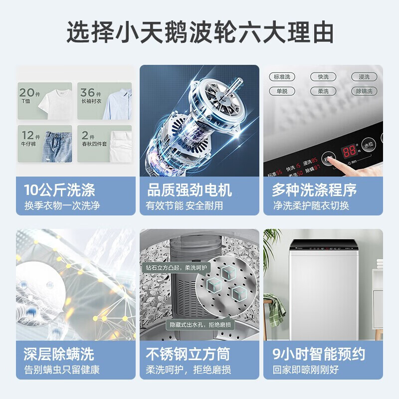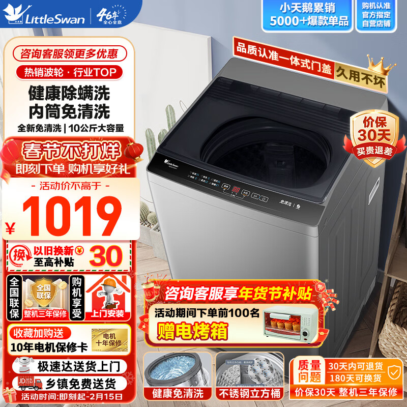 小天鹅(LittleSwan)10公斤波轮洗衣机全自动 家用节能宿舍租房 除螨内桶健康免清洗 品质电机TB100V23H-1价格:1019.00元!