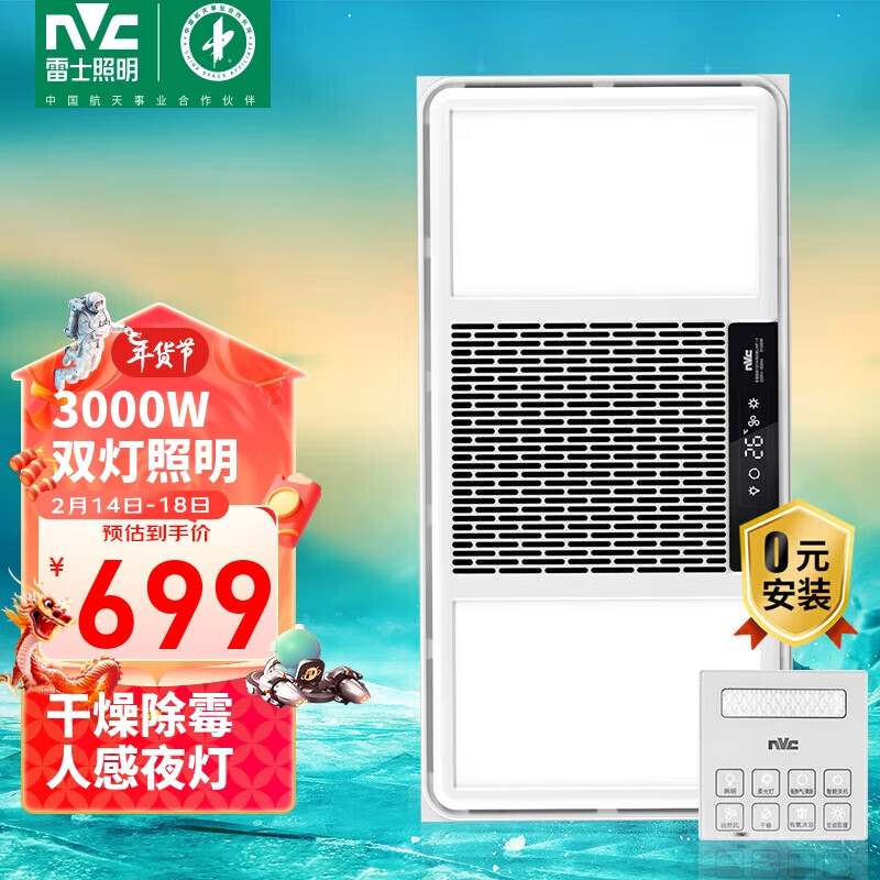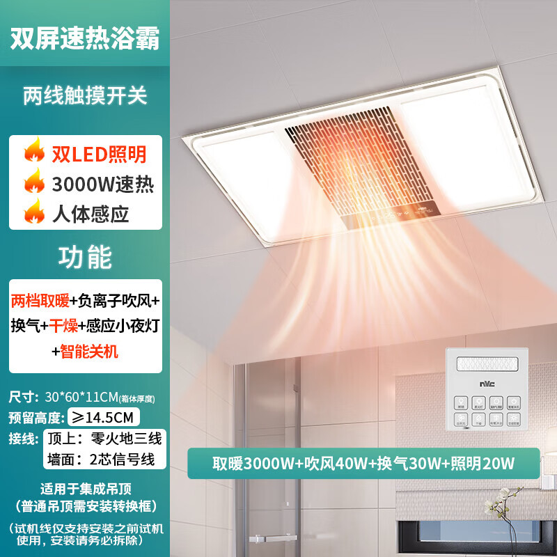 雷士(NVC)智能人感双LED灯浴霸暖风照明排气一体浴室取暖器卫生间集成吊顶价格:999.00元!