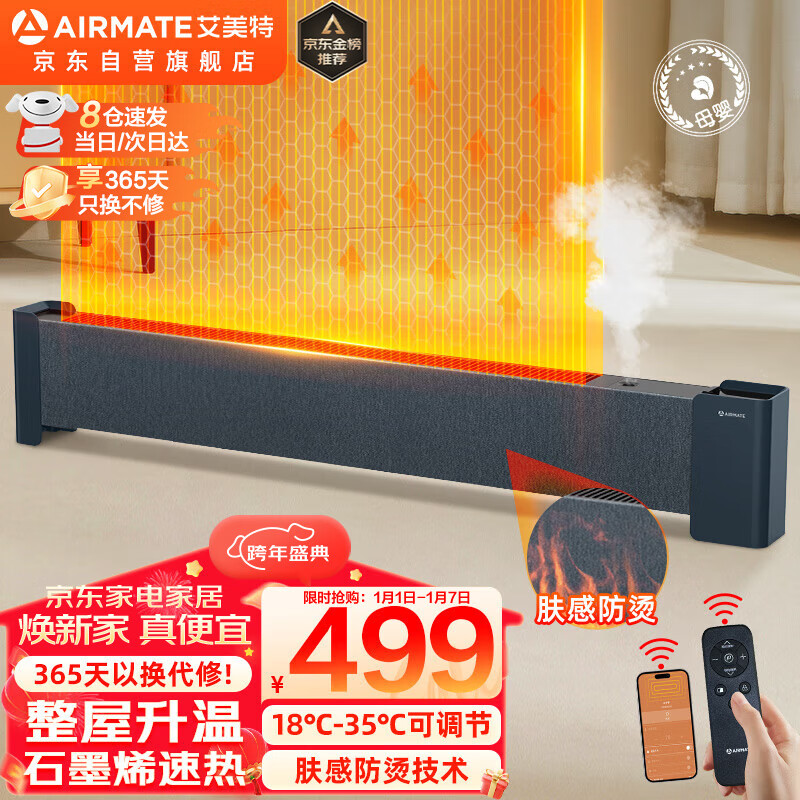 艾美特(AIRMATE)石墨烯取暖器踢脚线/电暖器/电暖气片家用移动地暖母婴肤感防烫雾化加湿节能浴室防水两用 【肤感防烫+智能WiFi款】雾化加湿A18 PRO价格:599.00元!