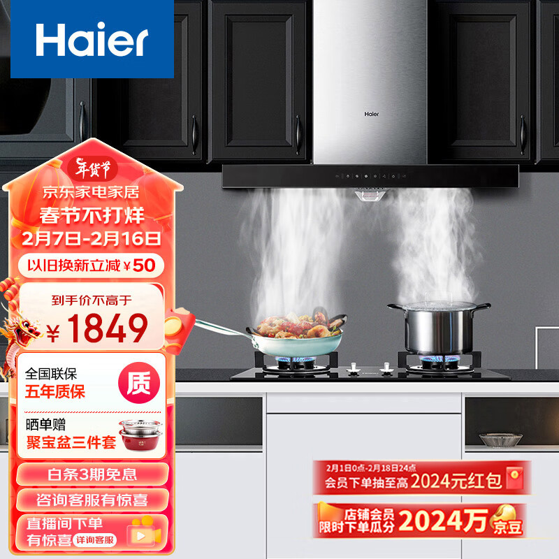海尔(Haier)抽油烟机 烟灶套装 21m3/min大吸力 挥手智控自旋洗 欧式家用吸油烟机燃气灶 T11+Q2BE2(液)价格:1849.00元!