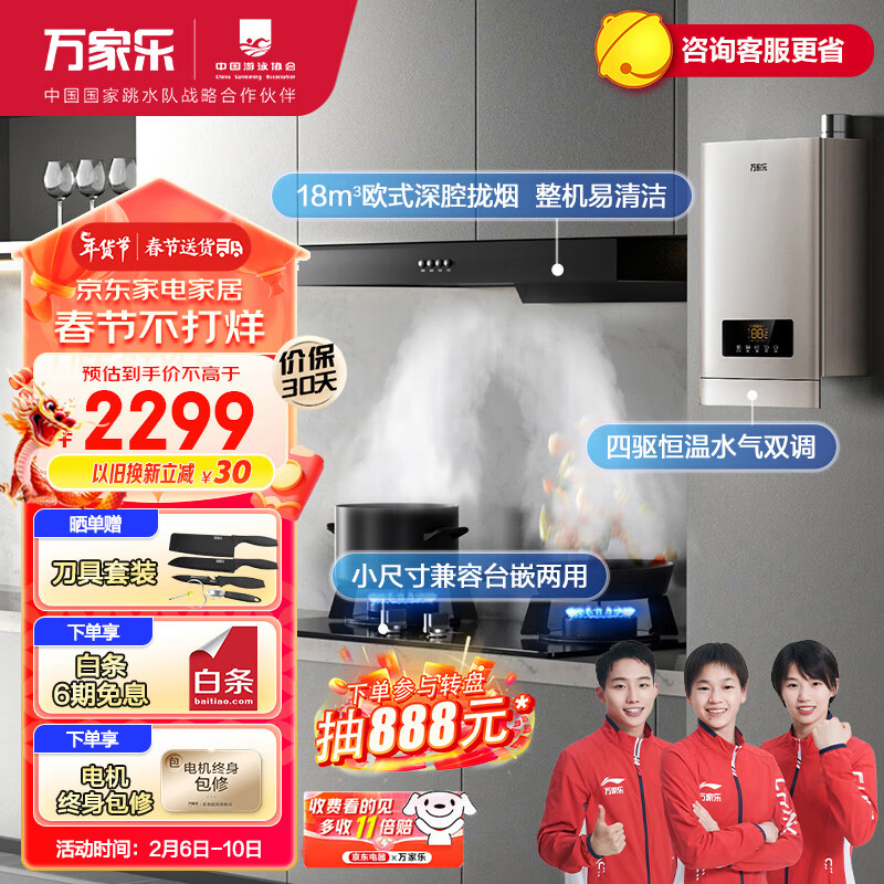 万家乐 抽油烟机18m3/min欧式油烟机4.2kW大火力燃气灶16升大水量热水器三件套AT031+KA031B+16LD5天然气价格:2499.00元!