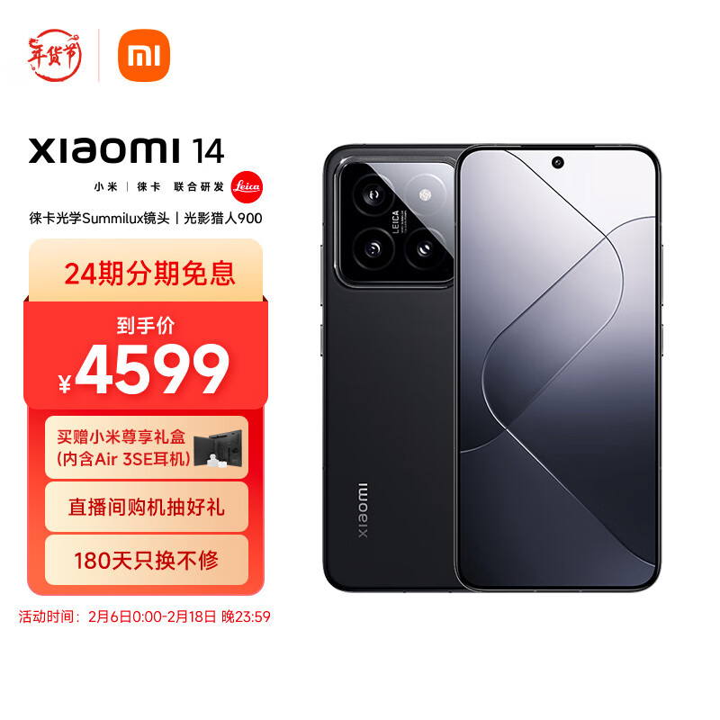 小米14 徕卡光学镜头 光影猎人900 徕卡75mm浮动长焦 骁龙8Gen3 16+512 黑色 小米手机 红米手机 5G价格:4599.00元!