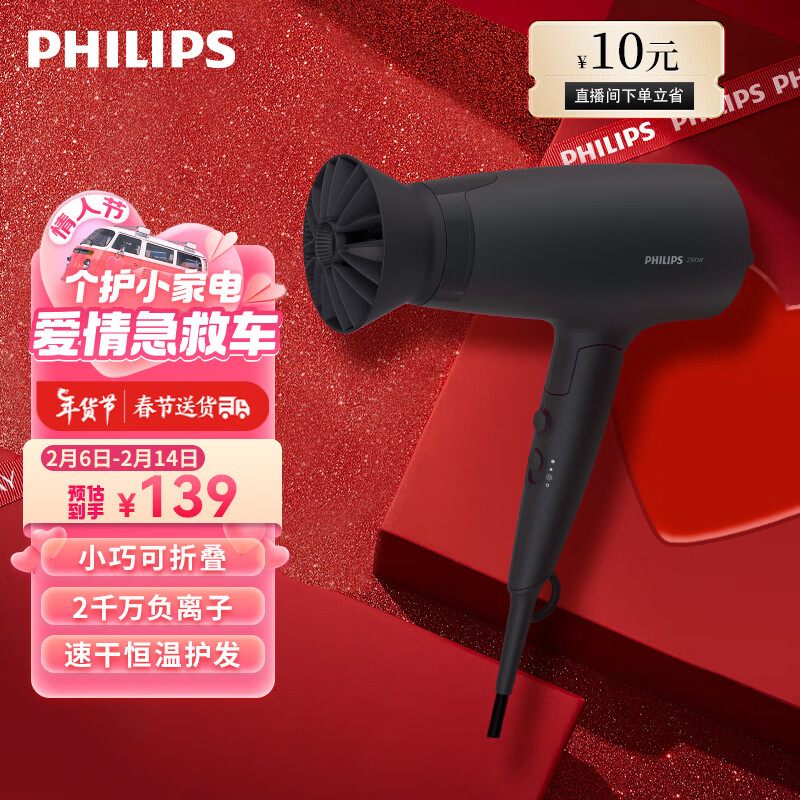 飞利浦(PHILIPS)电吹风机 3系小花筒 低温速干大功率 负离子护发 小花筒 黑色 可折叠家用价格:139.00元!
