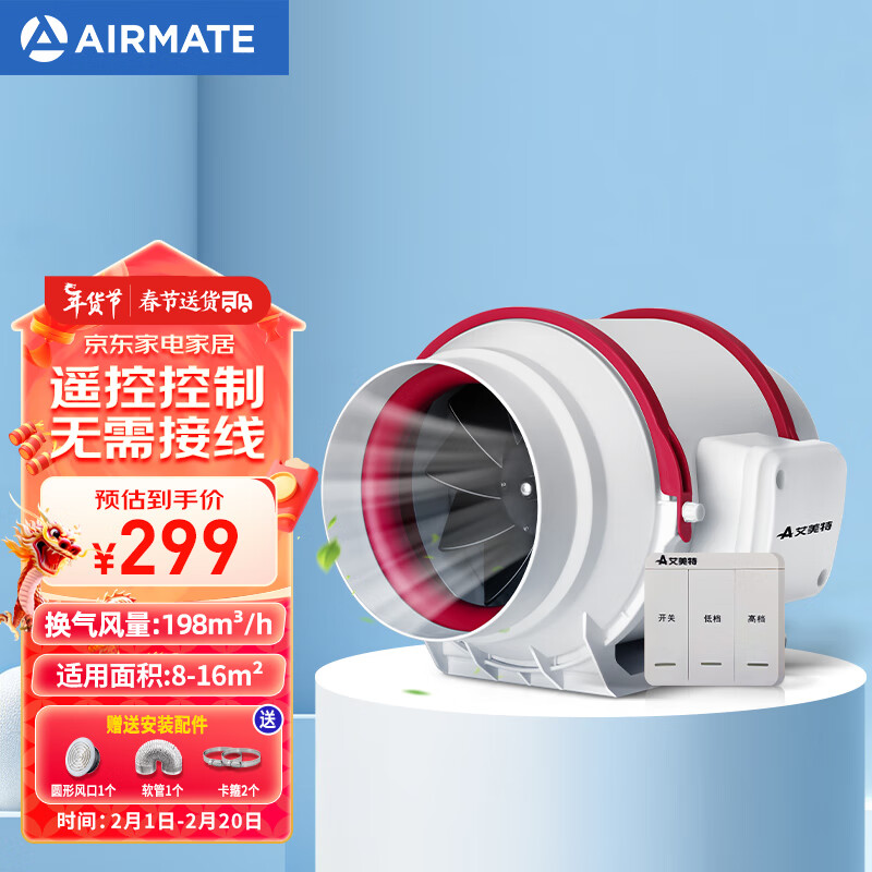 艾美特(Airmate )DPT10-20AR管道风机厨房卫生间换气扇排气扇增压管道式4寸抽风机价格:299.00元!