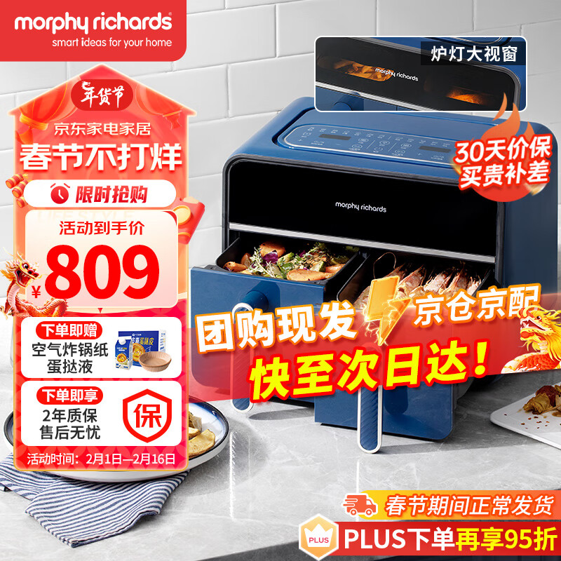 摩飞电器(Morphyrichards)空气炸锅 家用8L大容量可视双炸篮多功能空气炸烤箱 炸薯条鸡翅机MR8100轻奢蓝价格:809.00元!