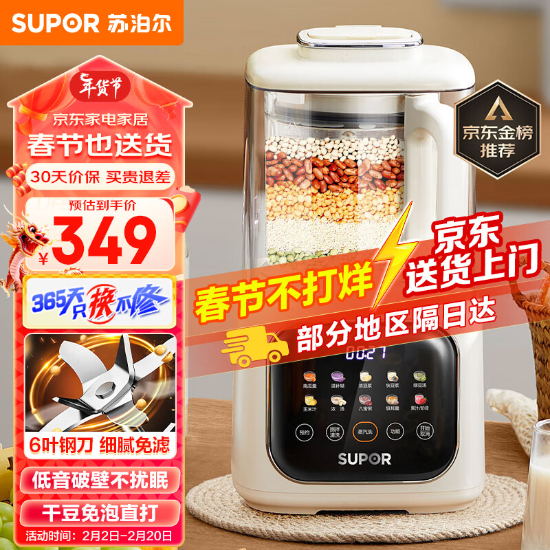 苏泊尔(SUPOR)降噪低音破壁机家用豆浆机 智能加热全自动榨汁机 有罩搅拌机 辅食机 早餐机SP613S价格:349.00元!