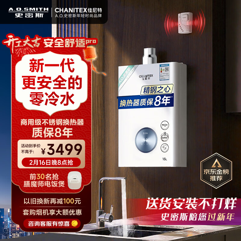 史密斯(A.O.SMITH)佳尼特16升燃气热水器 增压零冷水 不锈钢换热器包8年 负压更 恒温大水量 JSQ31-TJ1 以旧换新价格:3599.00元!