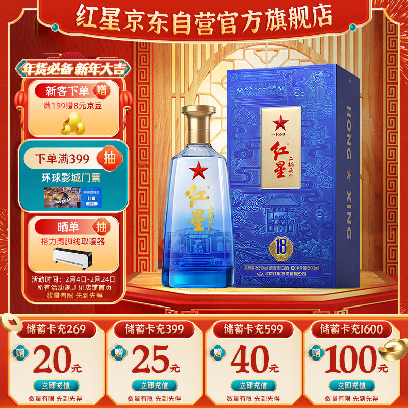 红星二锅头蓝盒18 清香型白酒 53度 500ml 单瓶装年货送礼价格:158.00元!
