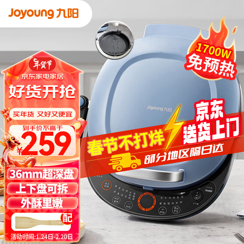 九阳(Joyoung)电饼档上下盘可拆洗早餐机36mm加深烤盘双面加热烙饼锅1700W大火力煎烤机JK30-GK565价格:259.00元!