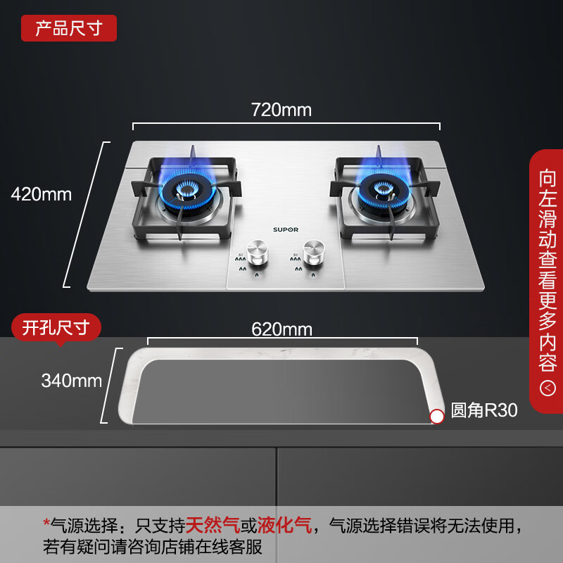 苏泊尔(SUPOR) 燃气灶双灶 液化气灶双灶具5.0kW家用猛火灶台 不锈钢面板台嵌两用 点火即燃 S16液化气价格:598.00元!