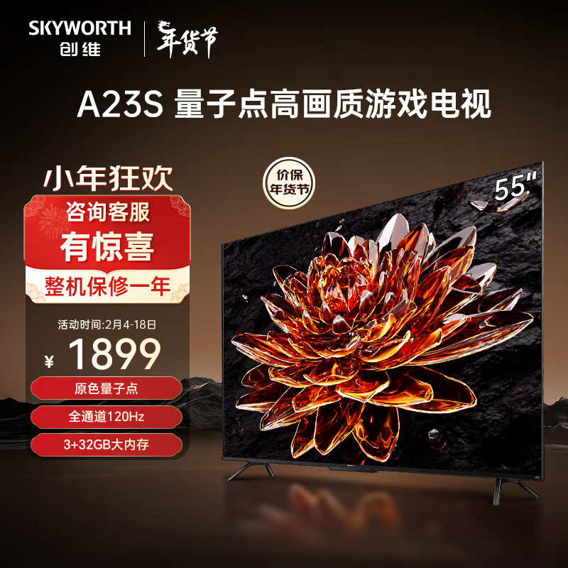 创维电视55A23S 55英寸电视机量子点120Hz高刷3+32G蓝牙5.0双频WIFI 4K超高清声控屏游戏电视价格:1899.00元!