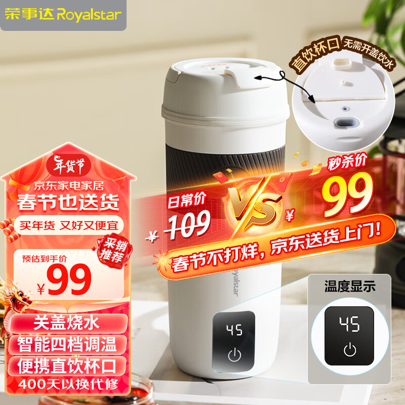 荣事达(Royalstar)电热水杯电水壶烧水壶便携式家用旅行电热水杯随行冲奶泡茶烧水杯办公室养生保温杯RS-CP03Q价格:109.00元!