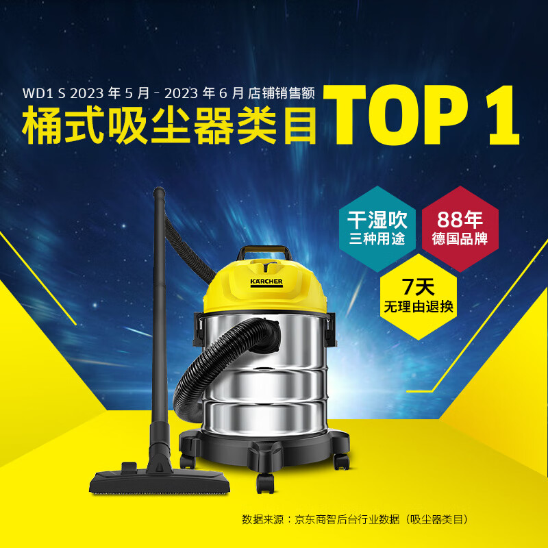 KARCHER德国卡赫 桶式吸尘器18L 干湿吹家用 地毯大吸力大功率吸尘器WD1s价格:389.00元!
