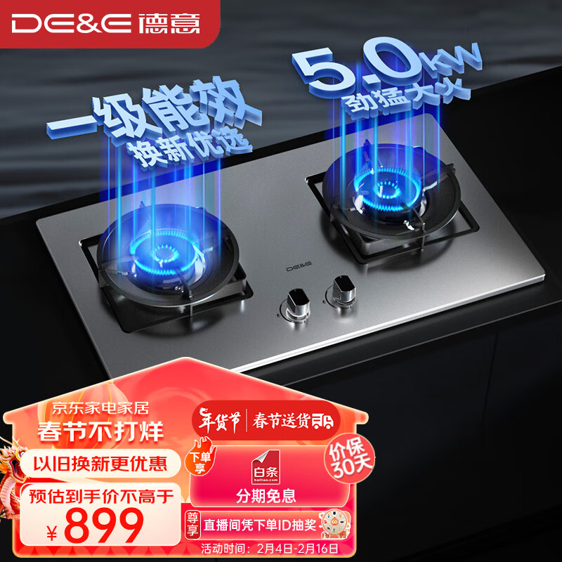 德意(DE&E)燃气灶 天然气 不锈钢 双眼灶具 5.0kW大火力 高热效率 全尺寸适配嵌入式灶具JZT-716G价格:949.00元!