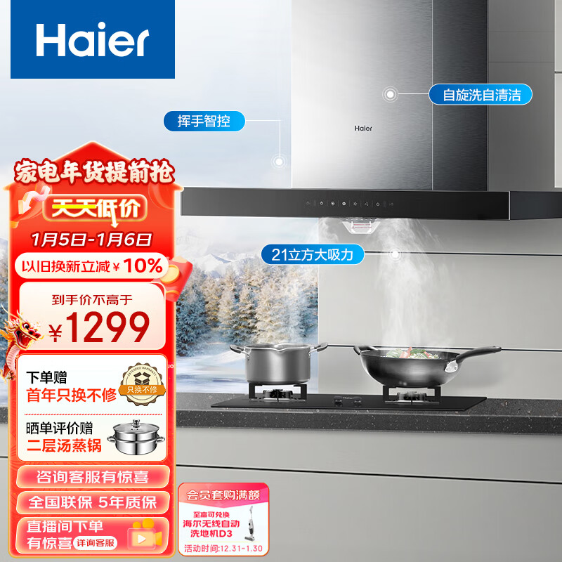 海尔(Haier)抽油烟机 欧式 顶吸排烟机 21m3/min大吸力 自动清洗 挥手智控 以旧换新 家用脱排油烟机T11价格:1399.00元!