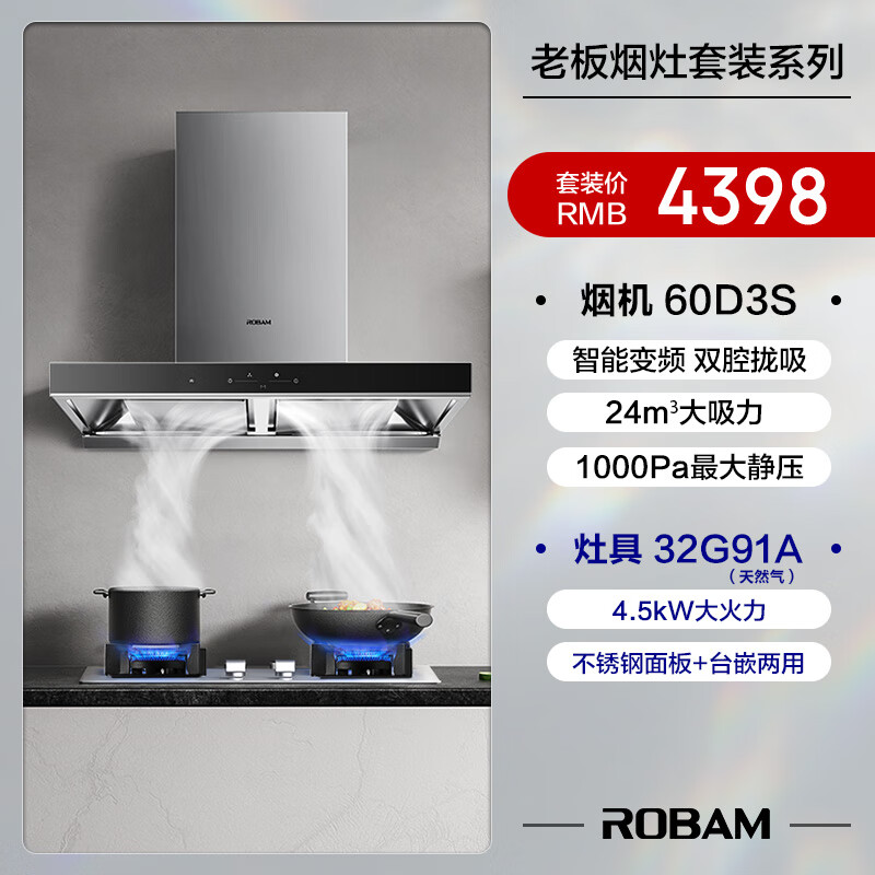 老板(Robam)抽油烟机D3S欧式顶吸双腔变频24大风量家用燃气灶吸油烟机灶具套装60D3S+32G91A(天然气)价格:4398.00元!