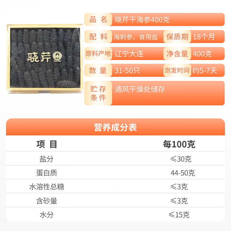 晓芹 大连干海参 400g31-50只 辽刺参 海参干货价格:4880.00元!