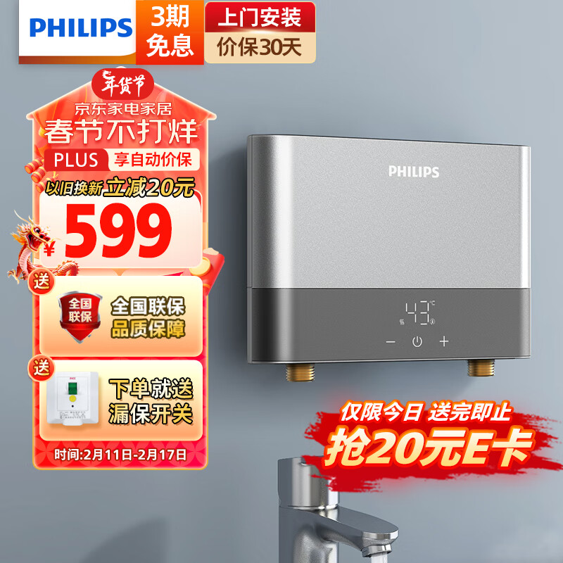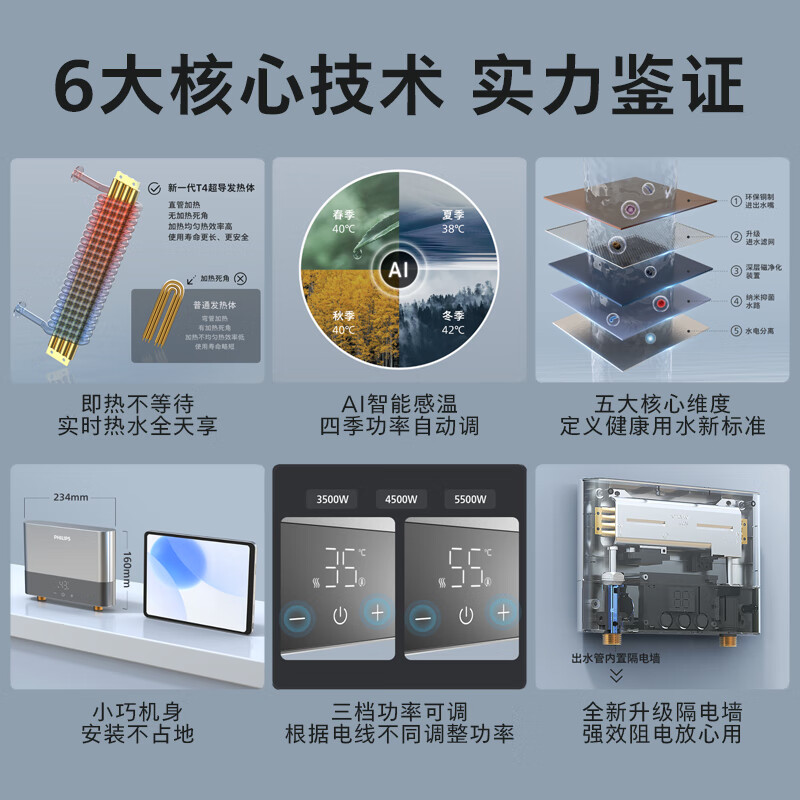 飞利浦(PHILIPS)即热式小厨宝电热水器 5500W智能变频不限水量 AI四季恒温家用即开即热免储水 小尺寸AWH1056/93价格:689.00元!