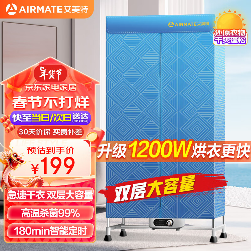 艾美特(AIRMATE)烘干机家用干衣机双层暖风定时烘干衣柜婴儿衣物消毒机 衣服风干机烘衣机HG12-K5价格:232.00元!