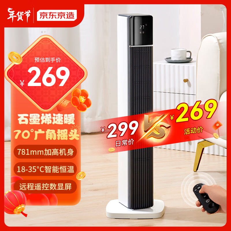 京东京造 高塔式石墨烯取暖器 家用暖风机 智能遥控电暖器 浴室暖风电热取暖器电暖气 智能恒温 触控显屏价格:269.00元!
