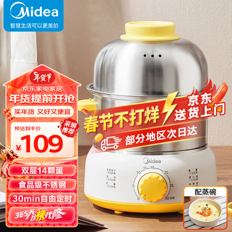 美的(Midea)煮蛋器蒸蛋器双层14颗蛋家用自动断电迷你鸡蛋羹神器防干烧不锈钢便携式MZ-ZDE1612价格:109.00元!
