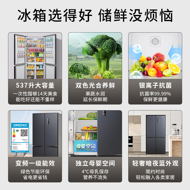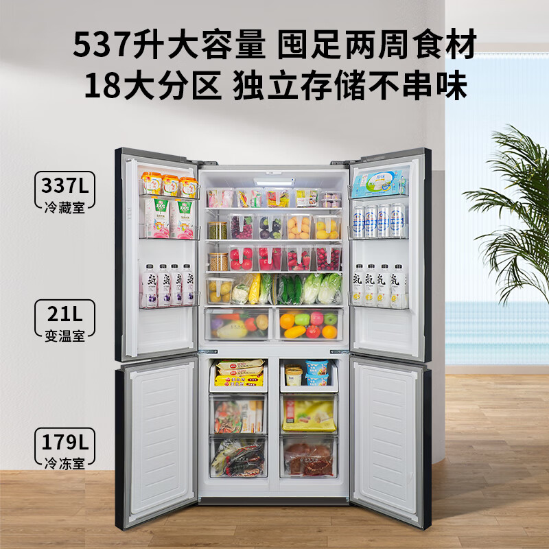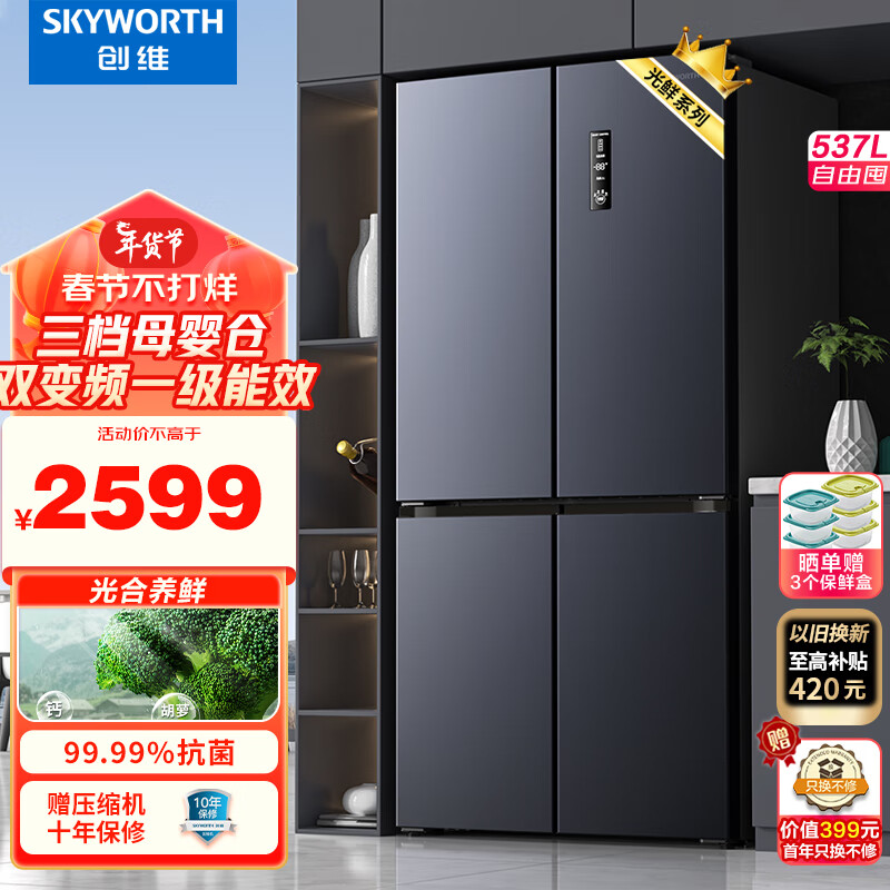 创维(SKYWORTH)光鲜系列537升十字对开门四开门风冷无霜一级能效家用电冰箱超薄嵌入大容量BCD-537W4B1价格:2599.00元!
