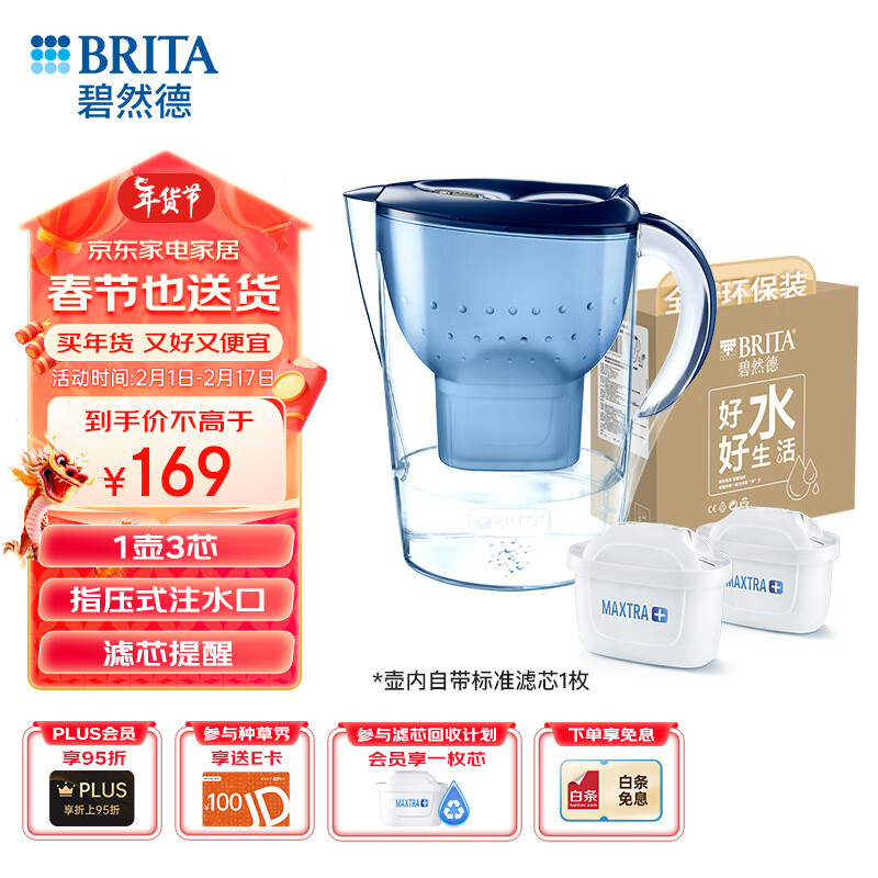 碧然德(BRITA) 过滤净水器 家用滤水壶 净水壶 海洋系列 3.5L蓝色 一壶3芯装 环保加固包装价格:169.00元!