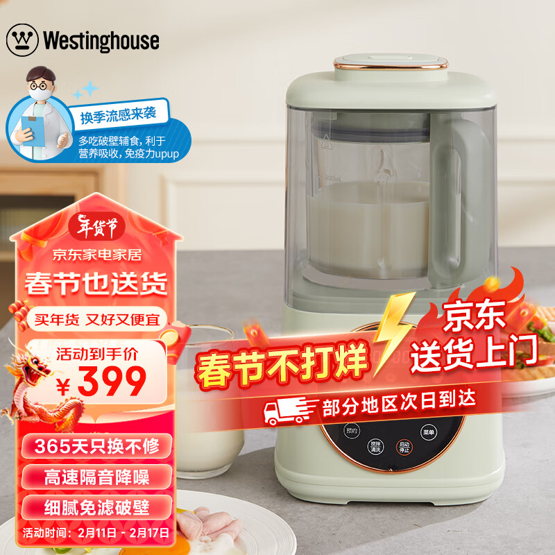 西屋(Westinghouse)柔音破壁机家用豆浆机加热全自动榨汁机搅拌机降噪辅食机 WPB09J8抹茶绿【年货送礼送父母送长辈】价格:399.00元!