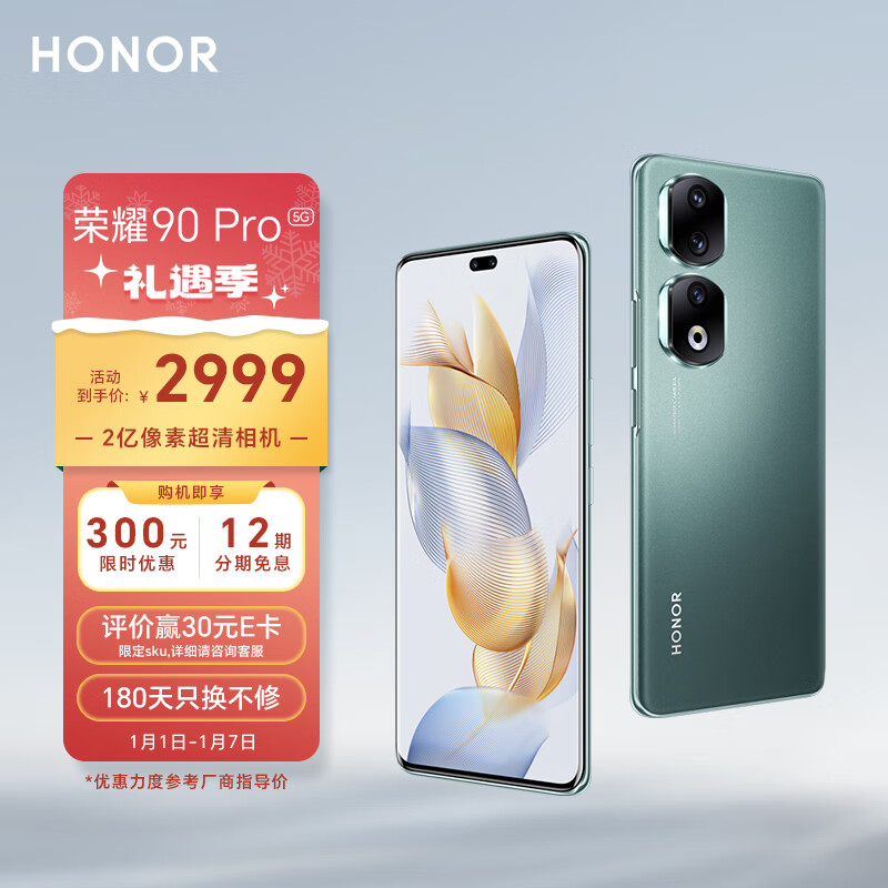 荣耀90 Pro 2亿像素超清相机 零风险调光护眼屏 5000mAh轻薄长续航 12GB+256GB 墨玉青 5G价格:2999.00元!