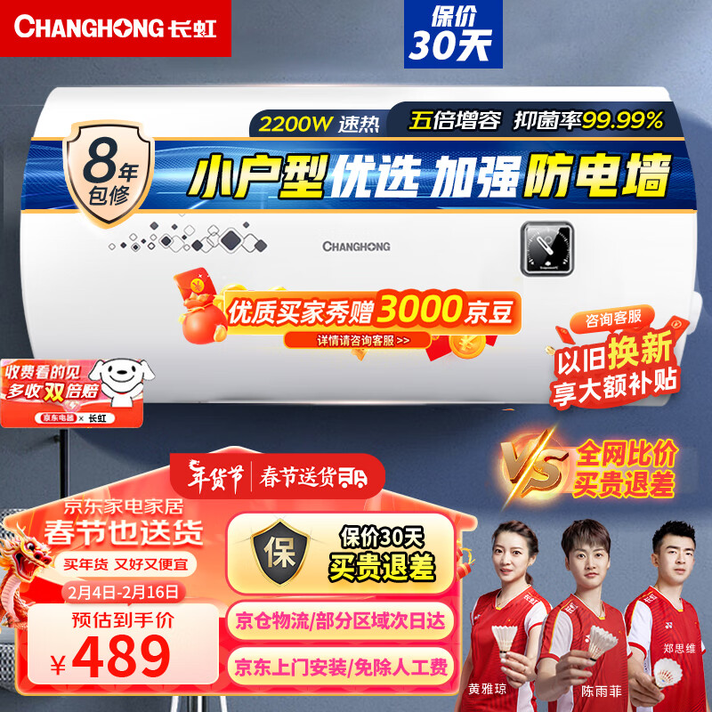 长虹(CHANGHONG)50升电热水器家用五倍增容2.2KW大功率速热节能保温小巧易操控抗腐耐用双重防漏电Y50J01价格:489.00元!