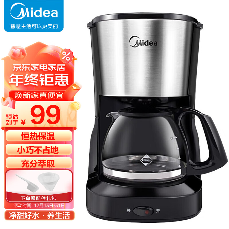 美的650ml容量保温美式滴漏半自动咖啡机家用恒热保温充分萃取煮茶器泡茶壶价格:99.00元!